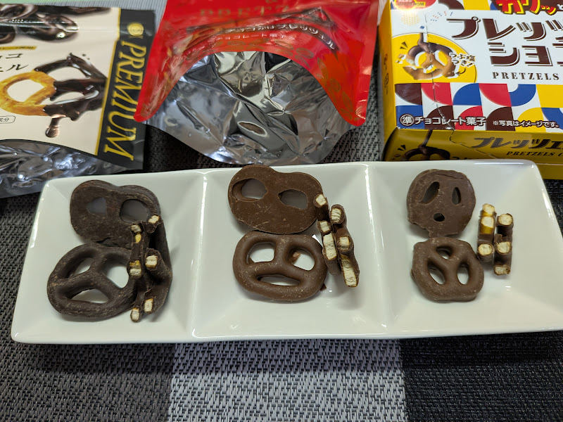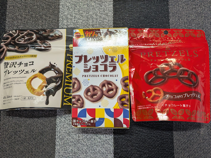 なお、以下でスーパーで買えるプレッツェルを比較しています。これで現時点で国内製のチョコプレッツェルは網羅できたように思います。