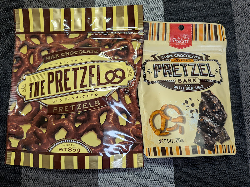 商品の入れ替わりが激しいカルディでも定番です。左はいわゆるチョコプレッツェルです。右はプレッツェルを砕いてチョコに混ぜたものです。