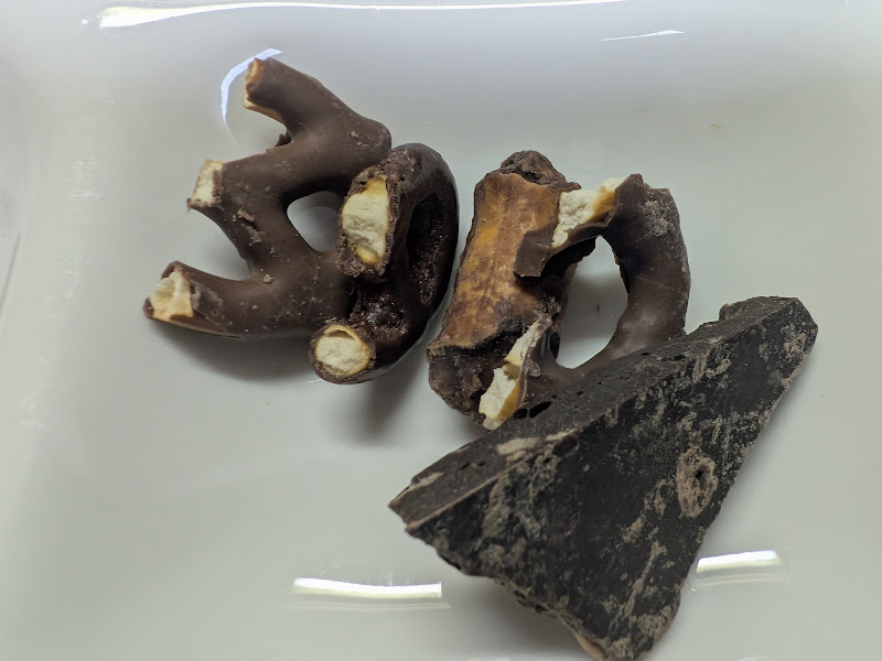 それぞれ折ってみました。どれも大差はありませんが、カルディのクラックプレッツェルはほとんどチョコです。