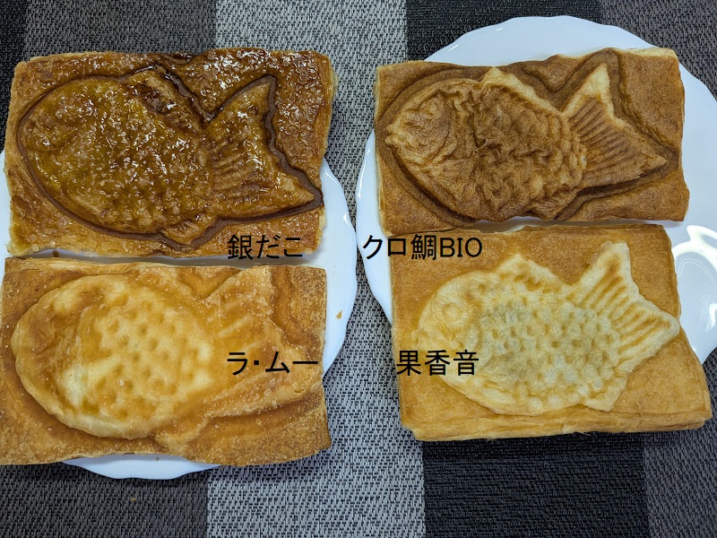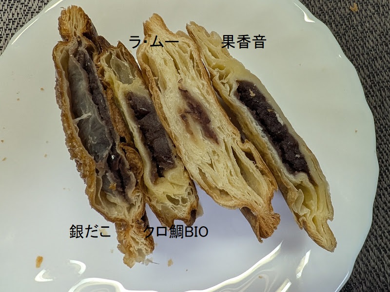 ラムーは常温密封なので、ちょっとモサモサしますね。アンコは少し安いようなボヤーとした味です。小豆の臭みのようなものもありますね。これは焼いてみるとパリパリ感とバターの風味もあって、それなら前二つに並びますね。