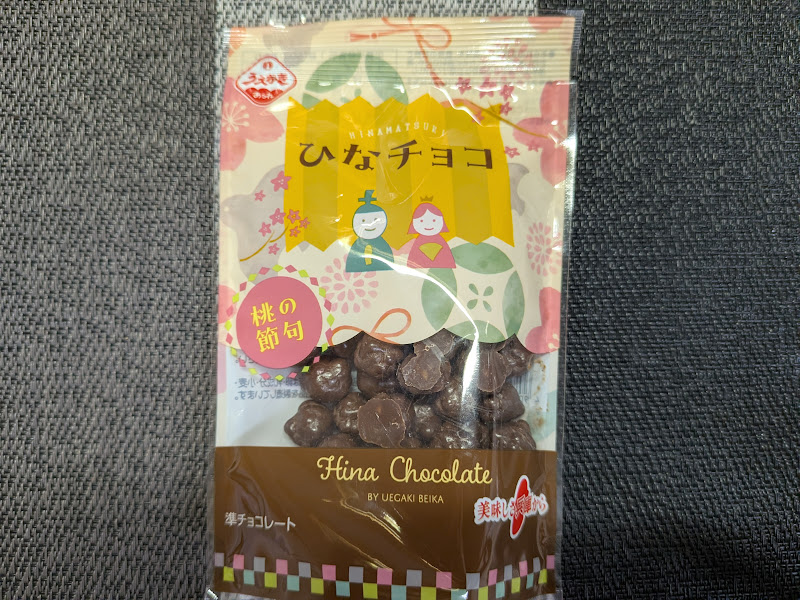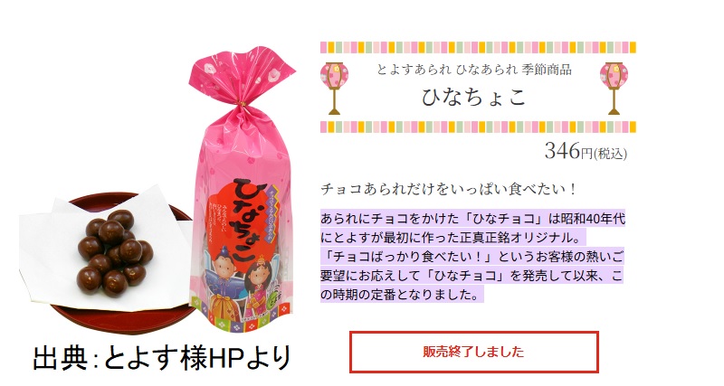 関西ではひなあられの定番「とよす」が以前から出している製品です。もともとあられにチョコがけが入っていましたが、そればっかり食べたいという要望に応じて昭和40年代に発売したのが始まりだそうです。今年は各スーパーで探していましたが、ついに見つけることができませんでした。ネットでも売っていないという記事もあり、一般にあまり出回っていないとは思われますが、とよすのオンラインでは販売はされていたようです(執筆時は売り切れ)