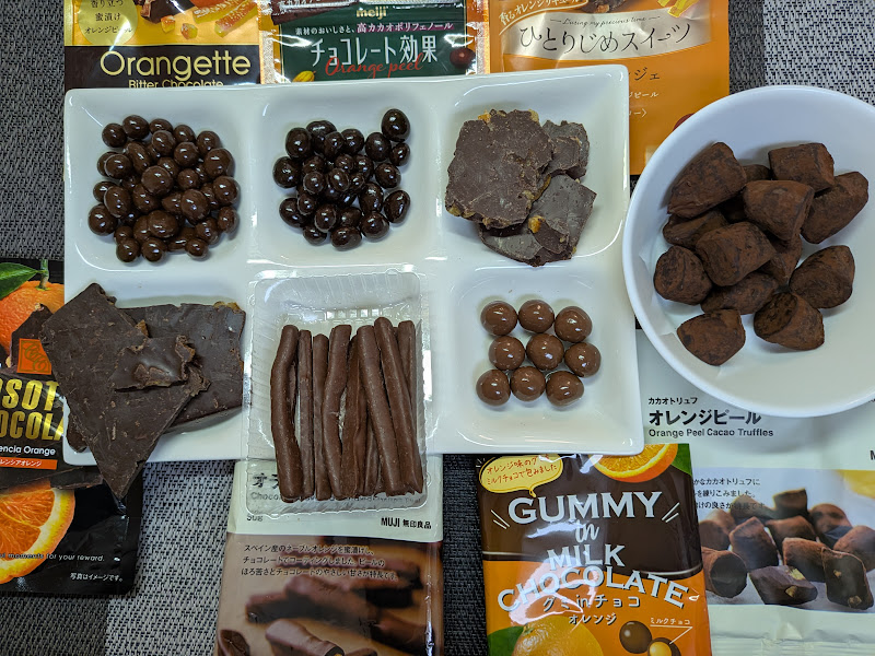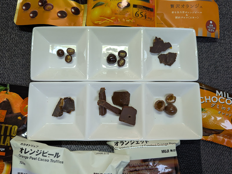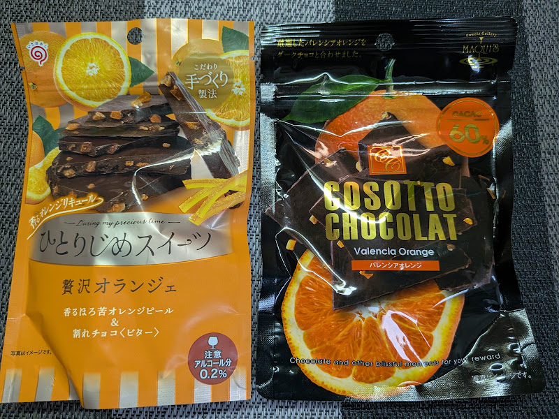 なお、他にはカルディにもオレンジ系チョコを多数確認しましたが、お手軽感や定番感がなく、今回は比較から外しました。